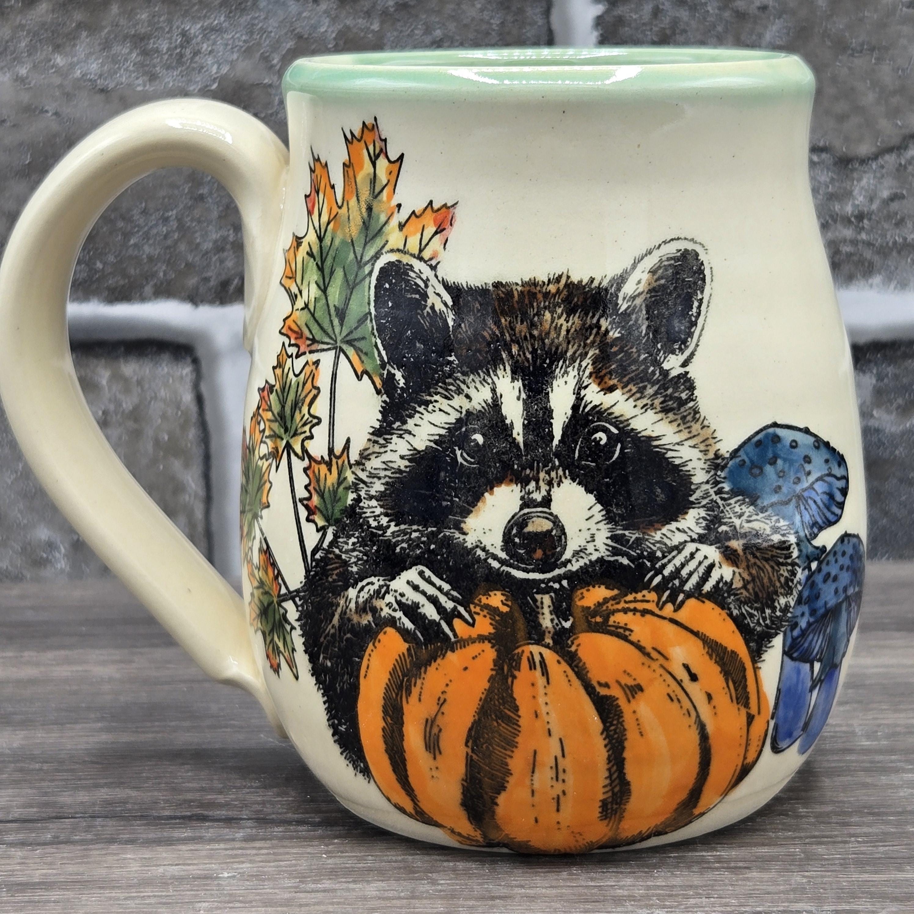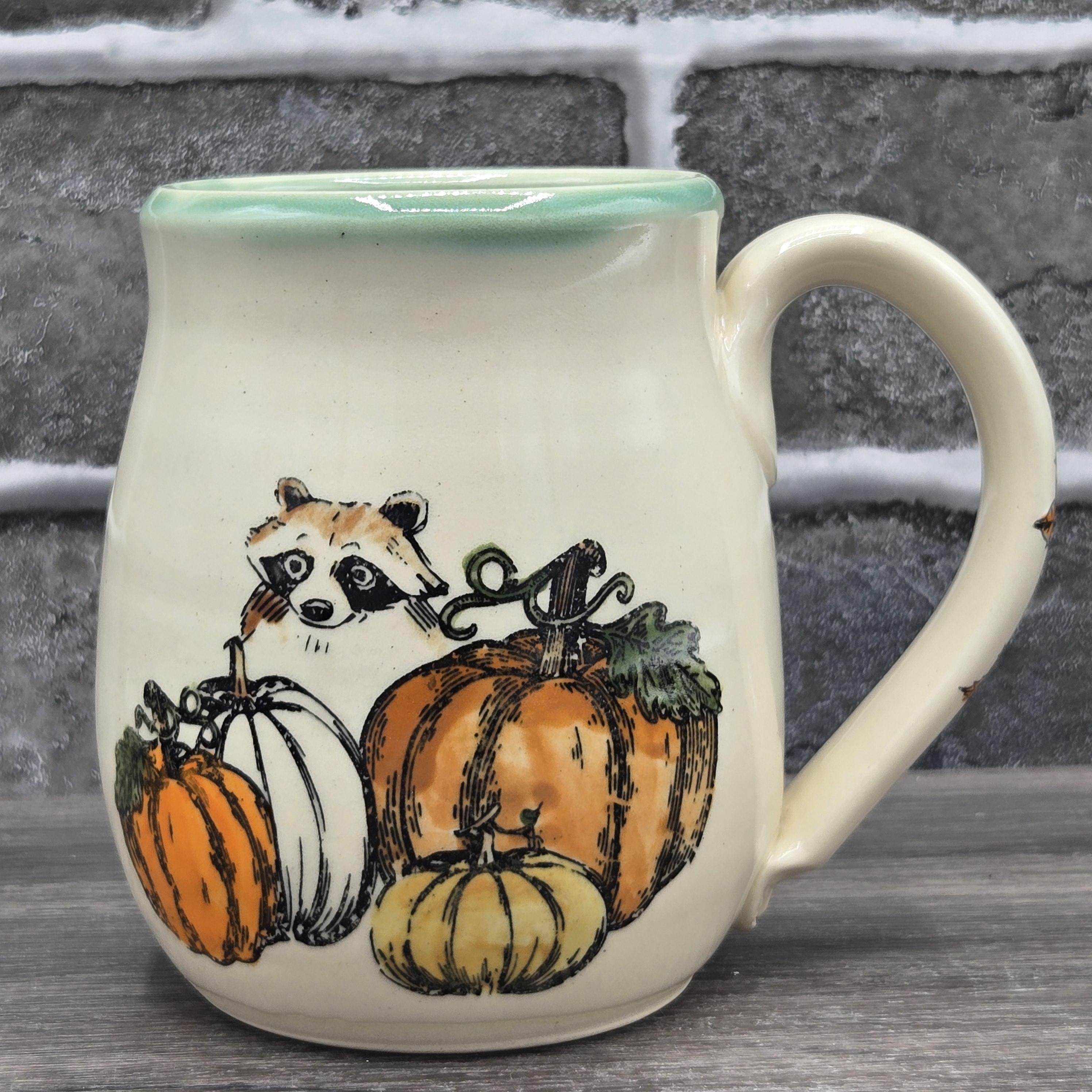 Dishwasher and microwave safe mug with your favorite trash panda companions hanging out in the pumpkin patch. All work is handmade, so will have small differences is glaze and shape.