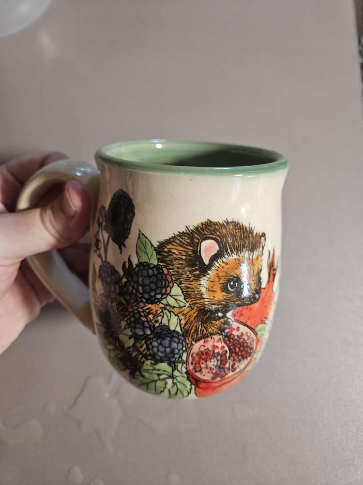 Hedgehog, pomegranate & blackberries mug, large mug ~14oz. Jade inside glaze. Dishwasher and microwave safe.