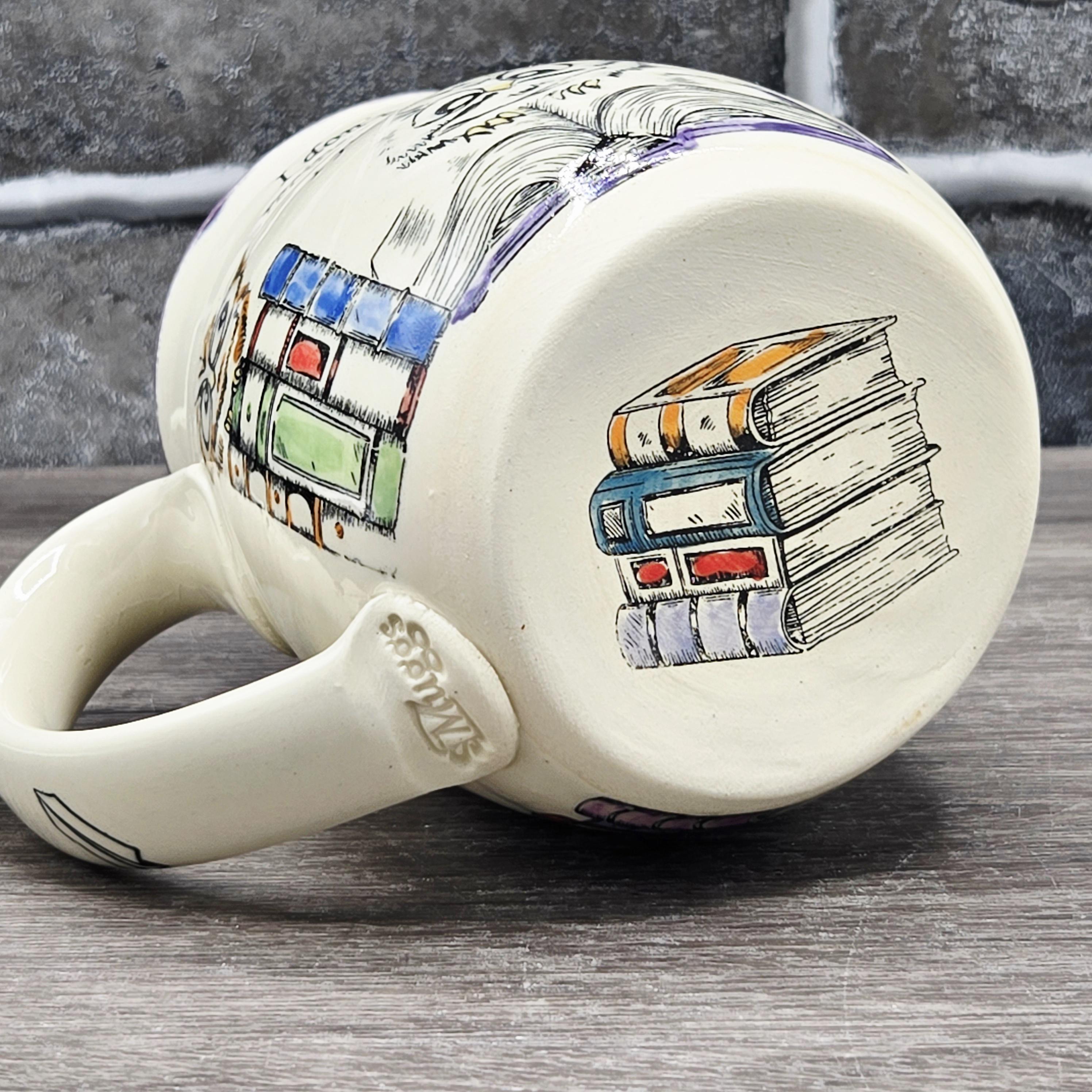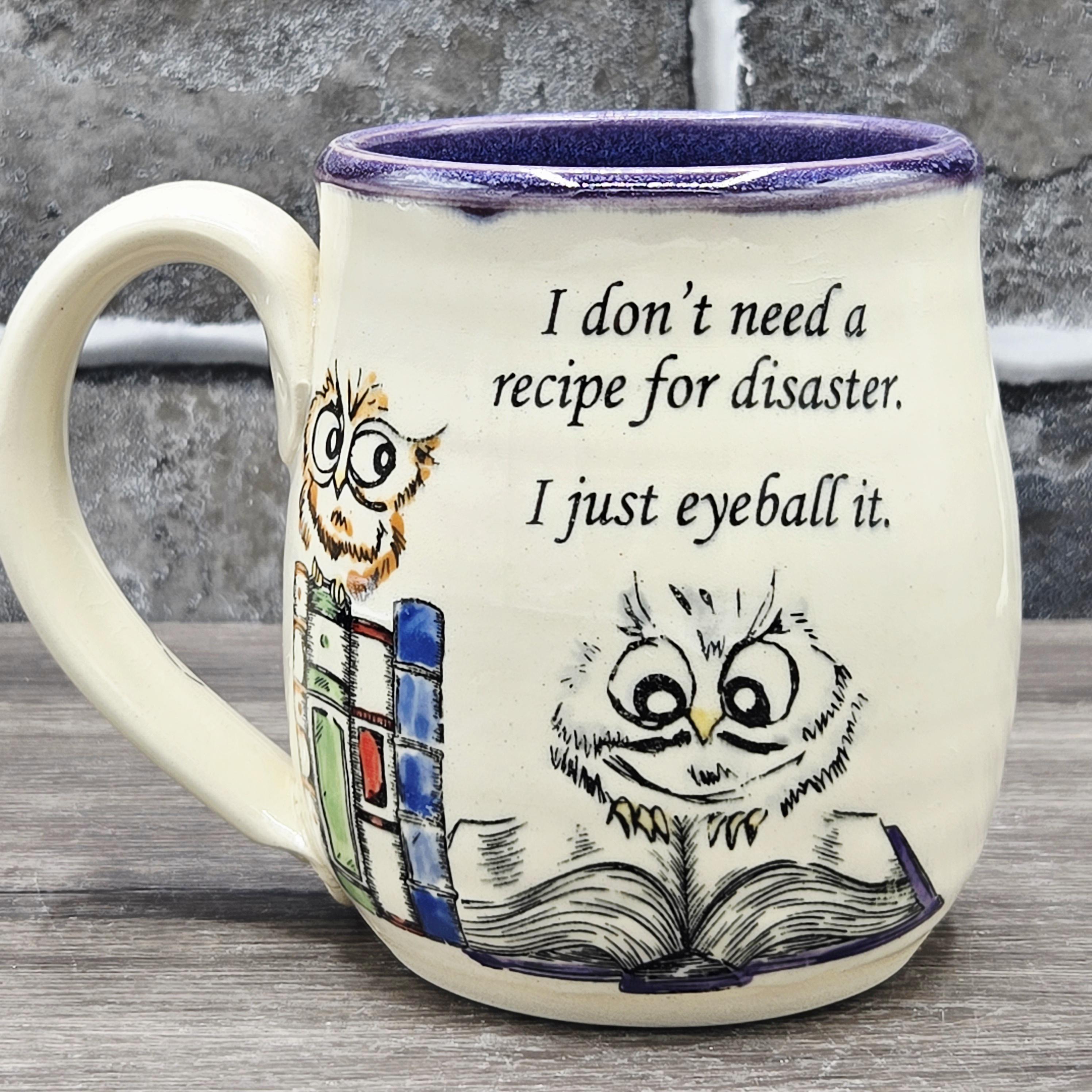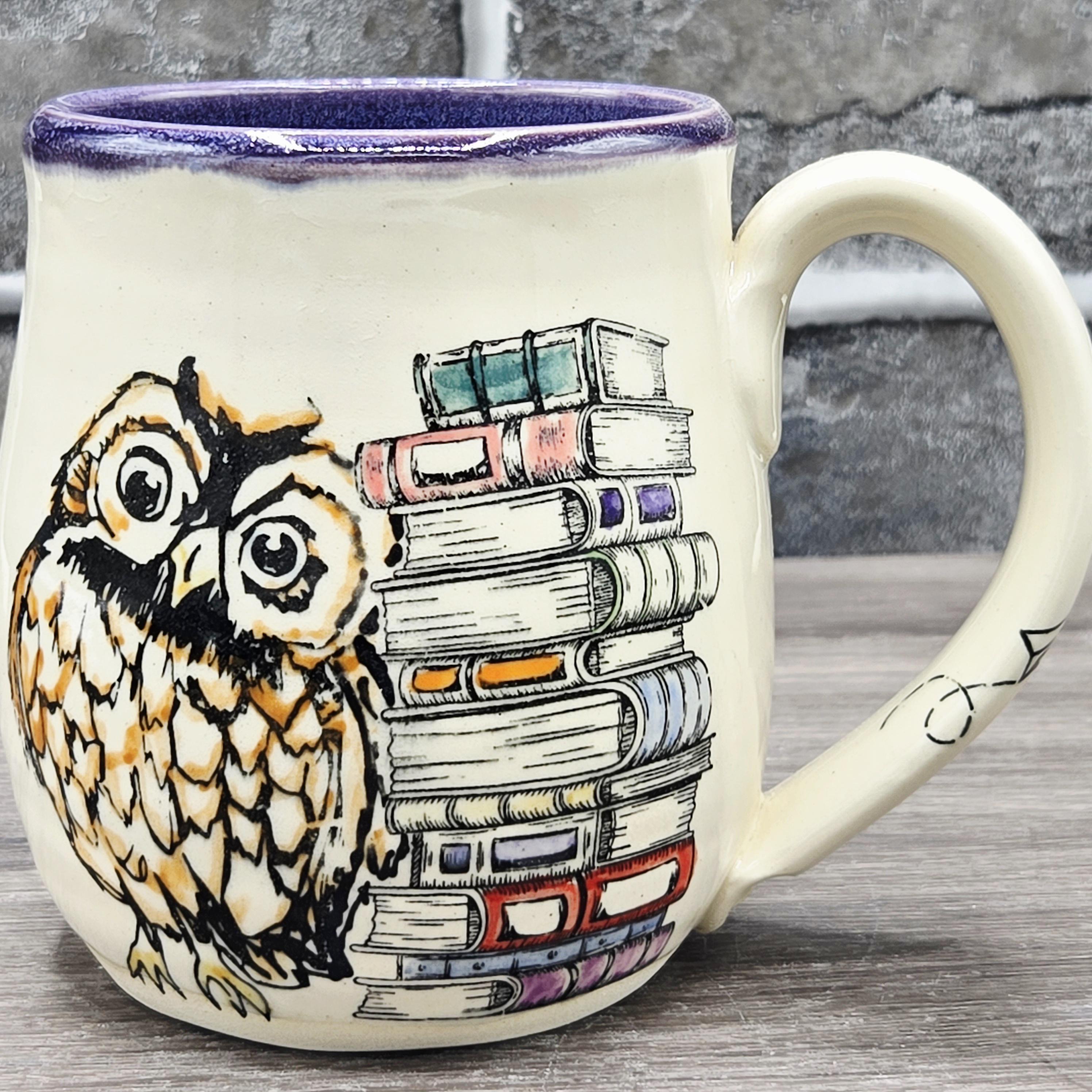 Large porcelain coffee mug. Handmade and painted. Holds 14 oz to keep your eyes wide and unblinking as you hunt for prey. Or whatever you gotta do, night owl.